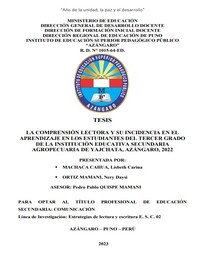 El trabajo de investigación que se presenta, tiene por enunciado: La comprensión lectora y su incidencia en el aprendizaje en los estudiantes del tercer grado de la Institución Educativa Secundaria Agropecuaria de Yajchata, Azángaro, 2022 Cuyo objetivo es determinar el nivel que predomina en la comprensión lectora y su incidencia en el aprendizaje en los estudiantes del tercer grado de la Institución Educativa Secundaria Agropecuaria de Yajchata, Azángaro.